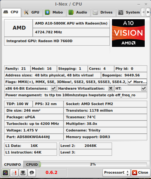 I have achieved a nice little overclock on the AMD 3.8/4.2 quad 5800k at 4.8ghz. The motherboard is an MSI FM2 A85XA-G65. I got this on the stock heatsink fan. The settings are 102x44 and volts at 1.5. I did not run run it long. Temp seemed to stay a 61c. I believe this temp is ok by AMD standards. Better cooling might get me more! This is the highest I have gotten. And it booted into Linux Mint 16 Cinnamon just fine. Sorry about lack of detail. I got excited and had to post.
