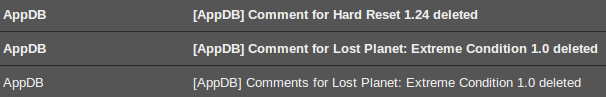 I am still getting notifications that my comments were deleted. This is unbelievable! I've never been part of any website/forum where my posts or comments were deleted on a regular basis. At this point I hesitate to comment on anything at AppDB If my comment doesn't apply to the current version of Wine, they delete it. Come on now! How can you let the community track the history of something if its deleted? Isn't that the whole point of forums and posting? I know AppDB isn't exactly a forum, but there are many times where I look back at the older posts to see if someone has found a solution to a problem. What if those were deleted and I never found that one-single-tip? They act as if old versions of Wine are completely obsolete, but we have proven otherwise. PlayOnLinux keeps all versions of Wine and patched versions. Thats because they know newer versions can sometimes break a game. So those archives and old posts need to be saved in order for us to track tips and solutions. Even if its for an old version of Wine. Sometimes that older version is the ONLY version that will work with a game.